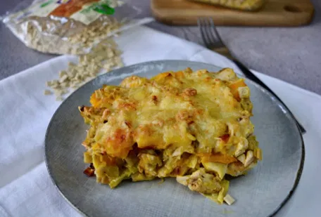 מערבבים את הפסטה המבושלת עם הבצל המטוגן, השמנת והתבלינים. טועמים ומתקנים תיבול. אם צריך מעבירים לתבנית משומנת.
