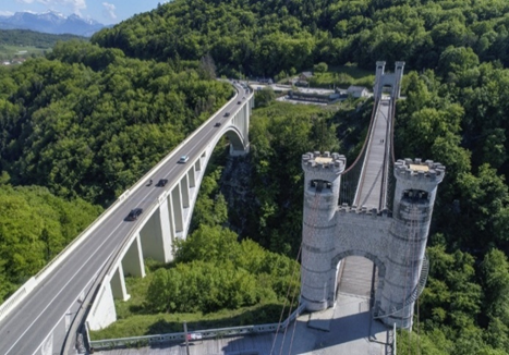 הראשון, גשר צ'ארלס אלברט דוכס סַבוּאָה, באורך 192 מ', שנחנך ב-1839, הינו גשר-תלוי על כבלים, הראשון מסוגו באירופה, שנתמכים על ידי 4 מגדלים משוננים בחלקם העליון, דמויי צריחים. הגשר עצמו עשוי מלוחות עץ ומיועד כיום להולכי רגל ורוכבי אופניים. אגב אופניים, הגשר זכה לארח קטע של הטור-דה-פראנס בשנת 1919. בנוסף, הגשר נחשב למונומנט היסטורי מאז 1966.